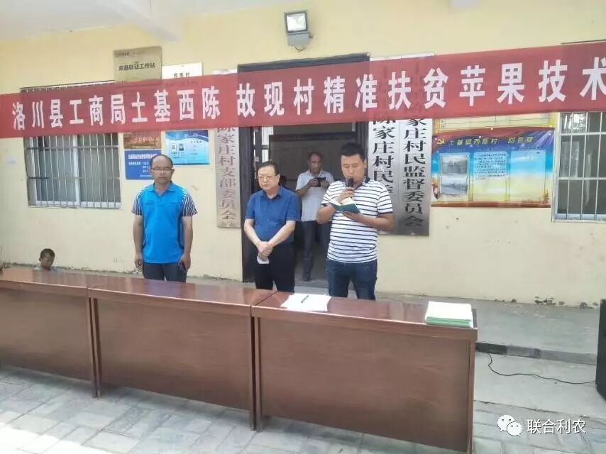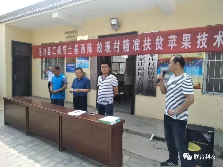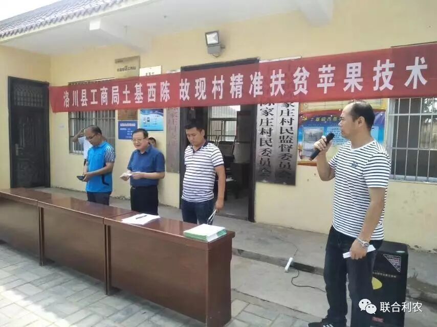 精准扶贫任重而道远,2017-08-15洛川工商行政管理局在土基镇陈家庄村与联合利农公司组织优质产品,发挥技术优势,助力洛川扶贫攻坚,“授人以鱼不如授人以渔”公司技术部为扶贫户讲解“当前富士果园”管理。
